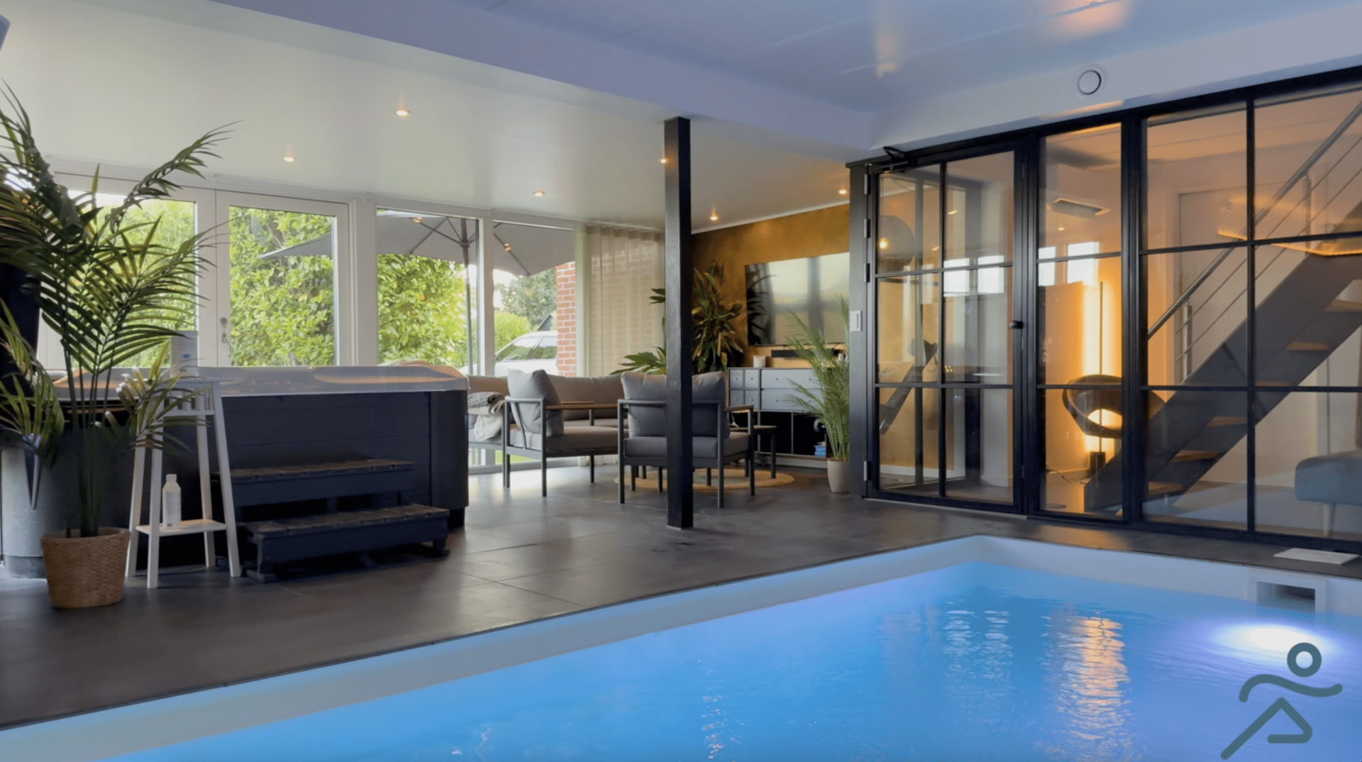 Med 9 × 3 meter er der god plads til at boltre sig, og vandet holder en stabil temperatur året rundt. Et ideelt sted til wellness, velvære og afstresning – alene eller som par.